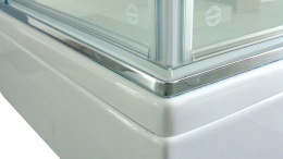 PSKRH 2/90 S shower cabin consist of two fixed walls and a two-part moving door. PSKRH 2/90 S shower cabin of the PREMIUM line is manufactured to be installed and lied on quadrantal shower-trays. The solid glass panels wall 8 mm thick are mounted by means of chrome-plated hinges. The glass door is 6 mm thick. Sealing between wall and filling panel is provided with a transparent sealing profile slipped over the glass. The joint with shower-tray is sealed up with silicon which works as a fastening agent at the same time. The threshold profile is to lead out randomly flowing water back to the shower-tray as well. At the top the glass adjustment is technically secured by a chrome-plated strut. Hinges as well as wall joints are manufactured lightened and make it for better sealing property owing to a straight flexible transparent sealing profile that is slipped over the glass of doors at the side where hinges are fixed. Flexible magnetic profiles secure utter closing and effectively seal the opposite side (in direction from glass wings) of the cabin. A horizontal double tongue sealing profile together with the threshold profile prevent water from flowing around the glass at the lower part of the cabin glass.